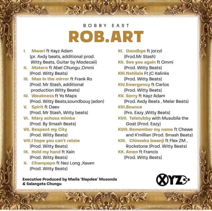 The title “Rob.Art” cleverly fuses his real name, Robert, with the word “art,” symbolizing his final, most intimate artistic expression. The album spans a mix of hip-hop, R&B, and Afro-fusion, showcasing Bobby East’s wide musical range and emotional depth. Collaborations with several notable Zambian artists enrich the project and add unique flavors to each track.